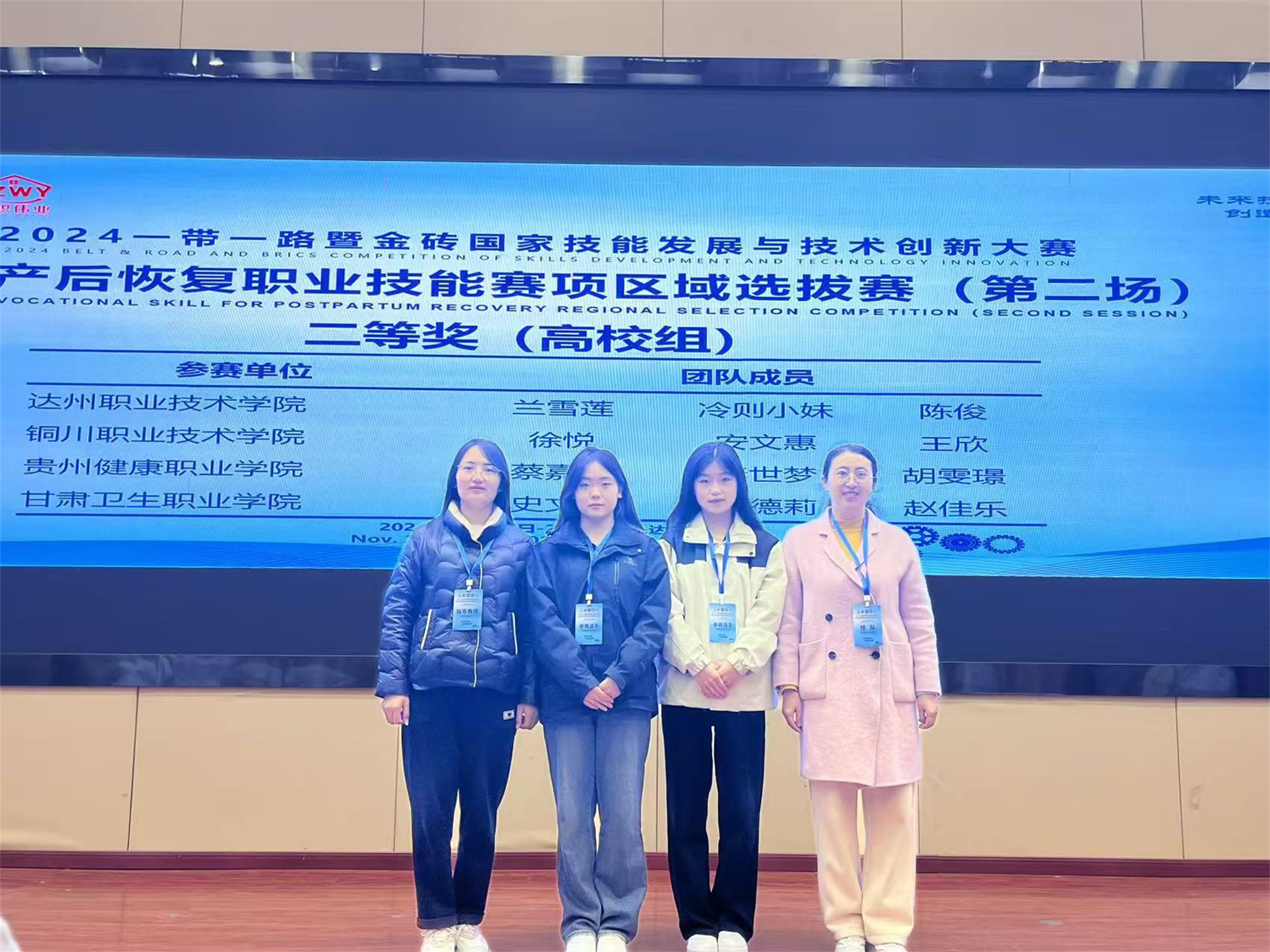 11月22日至24日,“2024一带一路暨金砖国家技能发展与技术创新大赛”首届产后恢复职业技能赛项选拔赛在四川达州职业技术学院举办。由威尼斯官网护理学院张艾丽、马晓燕两位老师指导的史文杰、张德莉、赵佳乐三位同学凭借扎实的专业技能和出色的临场表现,荣获大赛二等奖。