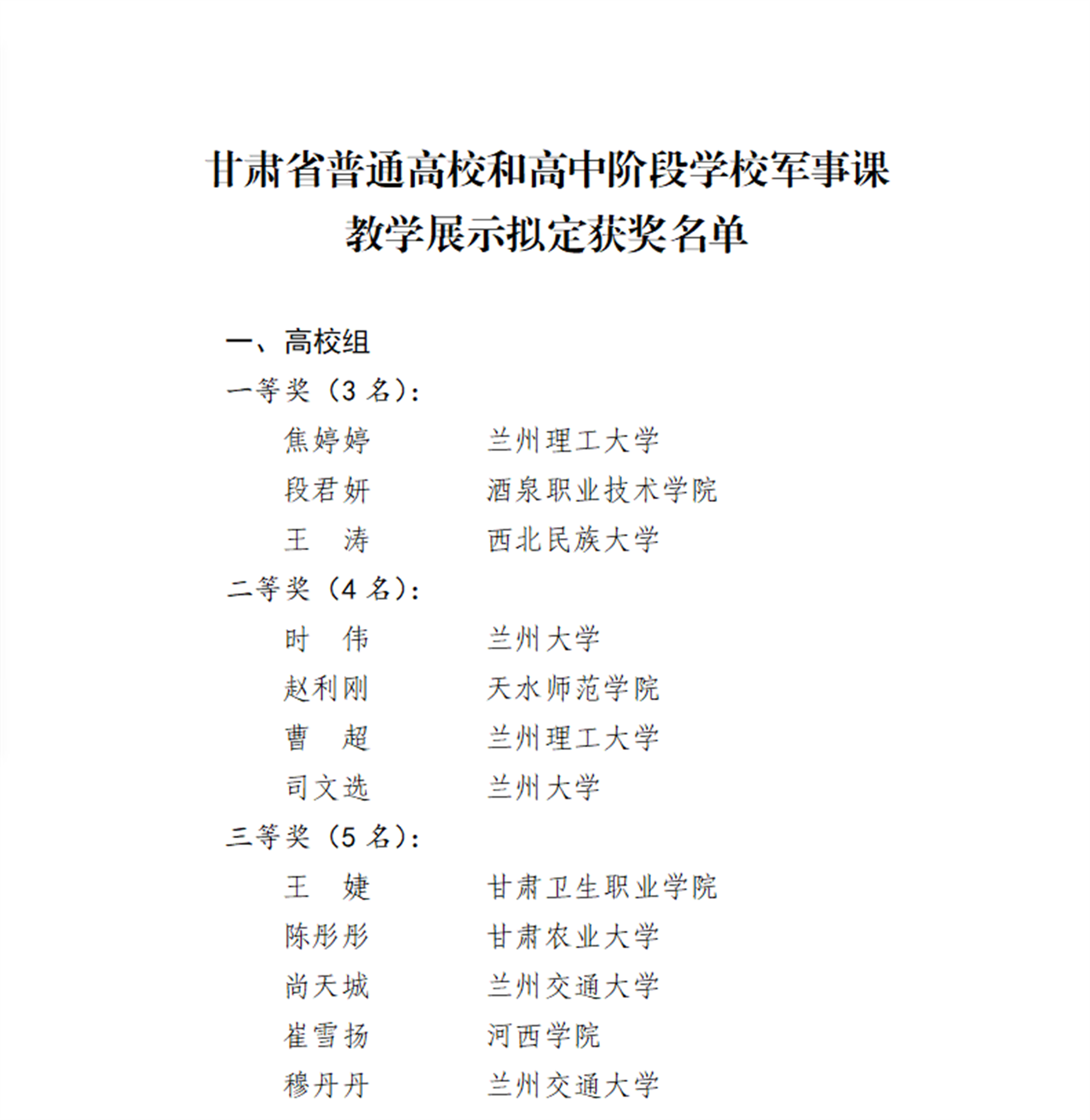 11月2日,由省教育厅主办、兰州理工大学承办的首届甘肃省普通高校和高中阶段学校军事课教学展示活动在兰州理工大学举办。全省共计78名军事课专兼职教师参加比赛,威尼斯官网王婕老师在决赛中表现优异,荣获三等奖。
