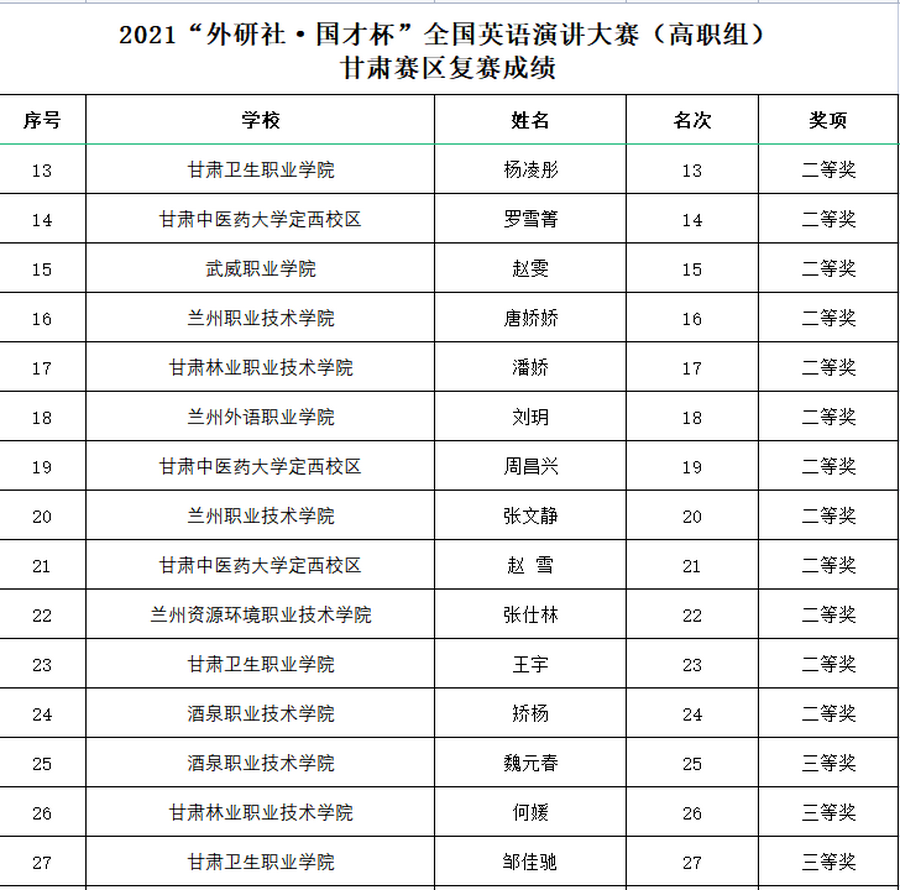 11月7日,2021年“FLTRP·ETIC Cup”English Public Speaking Contest由甘肃省教育厅、甘肃省大学外语教学研究会、外语教学与研究出版社主办,兰州外语职业学院承办,大赛以“Red Star Over China”《红星照耀中国》主题演讲,以激励青年学子学史力行、砥砺奋斗,用外语讲好中国故事、传播中国好声音。威尼斯官网2020级临床三年制15班杨凌彤(指导教师保静)、2018级护理五年制18班王宇(指导教师王丽娟)、2020级康复治疗技术三年制4班邹佳驰(指导教师高小静)代表学校参加甘肃赛区(高职组)线上复赛,经过激烈角逐分别获得两个二等奖、一个三等奖。