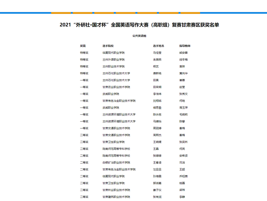 10月31日,2021“外研社·国才杯”全国英语写作大赛的复赛由甘肃省教育厅、甘肃省大学外语教学研究会、外语教学与研究出版社主办,兰州石化职业技术大学承办的比赛由看视频写作、看图表写作及看短文写作三个部分组成,通过“iTEST客户端”完成。威尼斯官网2020级护理三年制72班王晓媛(指导教师张奕林)、2020级针推17班郭淑嘉(指导教师钱磊)积极参加甘肃赛区(高职组)线上复赛,两人喜获二等奖。