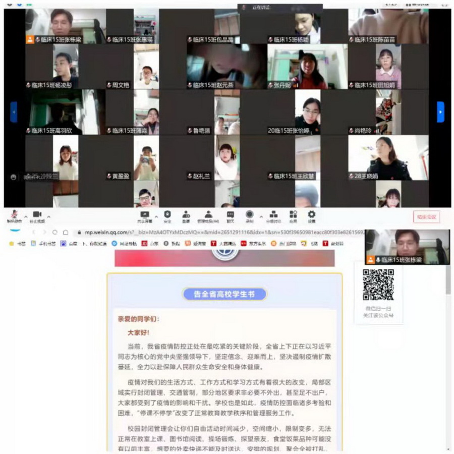 为深入学习贯彻甘肃省教育厅《告全省高校学生书》精神,做好疫情防控期间全校团员青年的思想引领工作,11月2日下午,校团委组织临床护理学院、中医药学院、医学技术学院各支部团员开展了“疫情期间,我们应该这样做”线上团课活动。