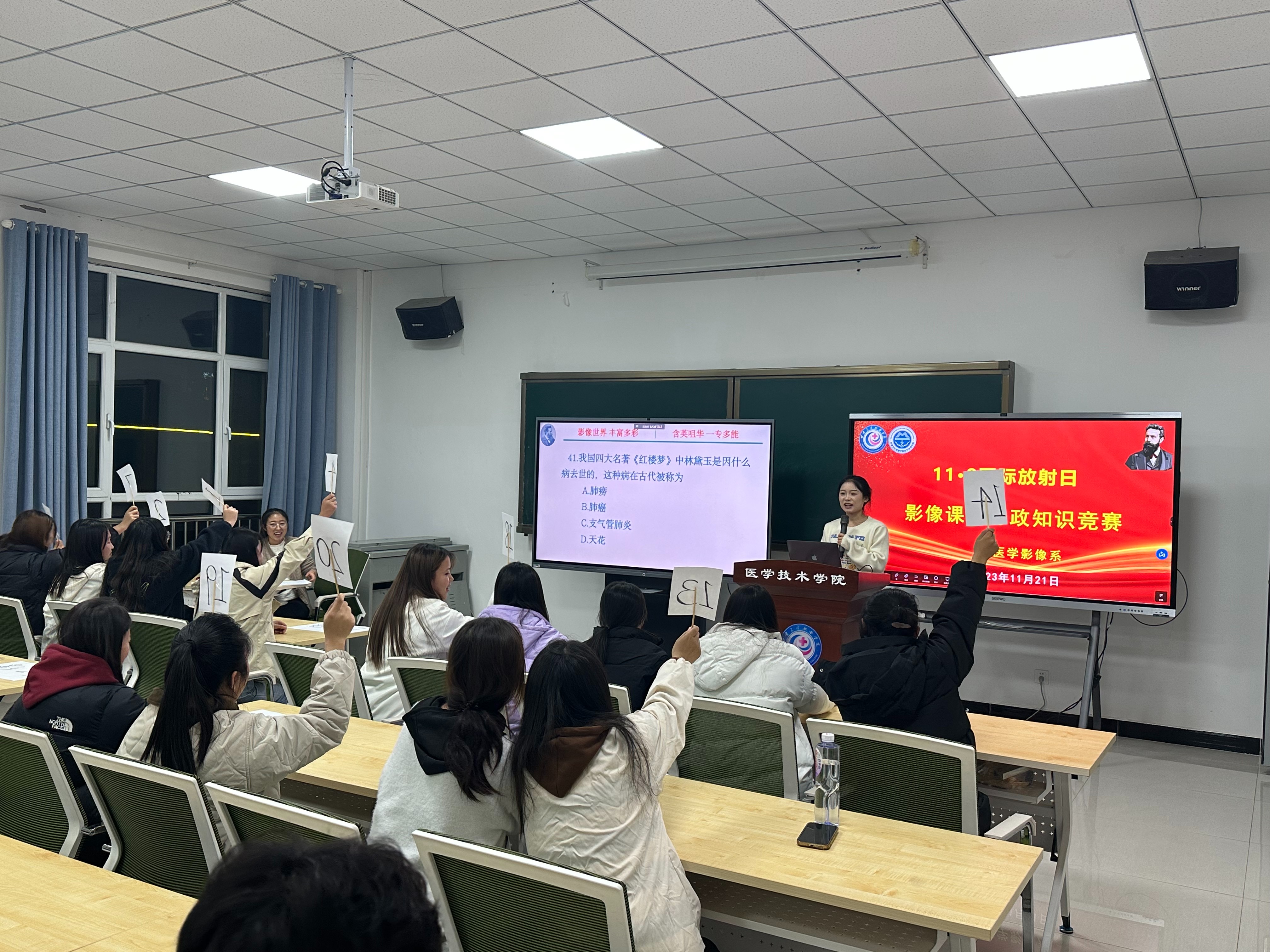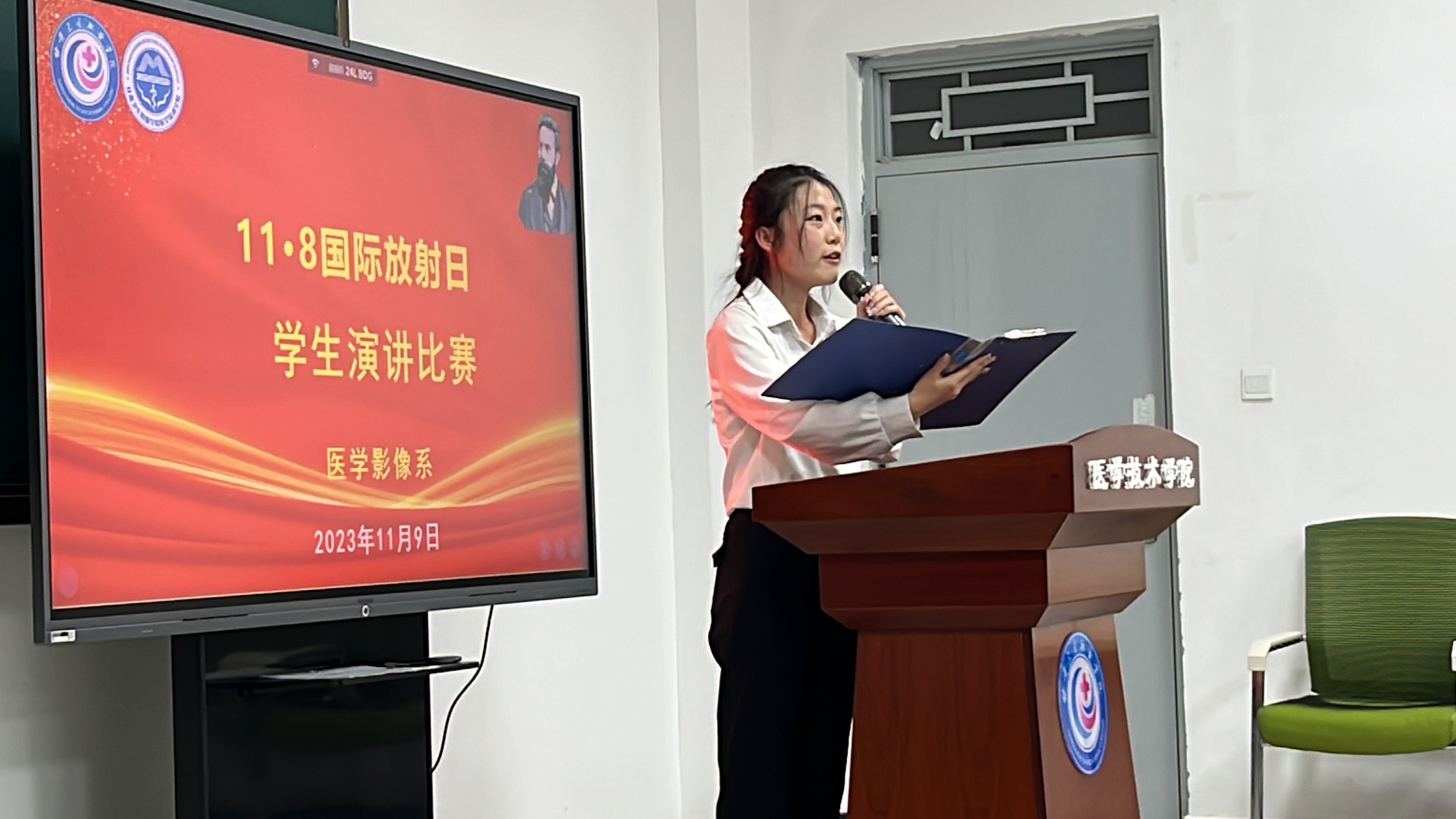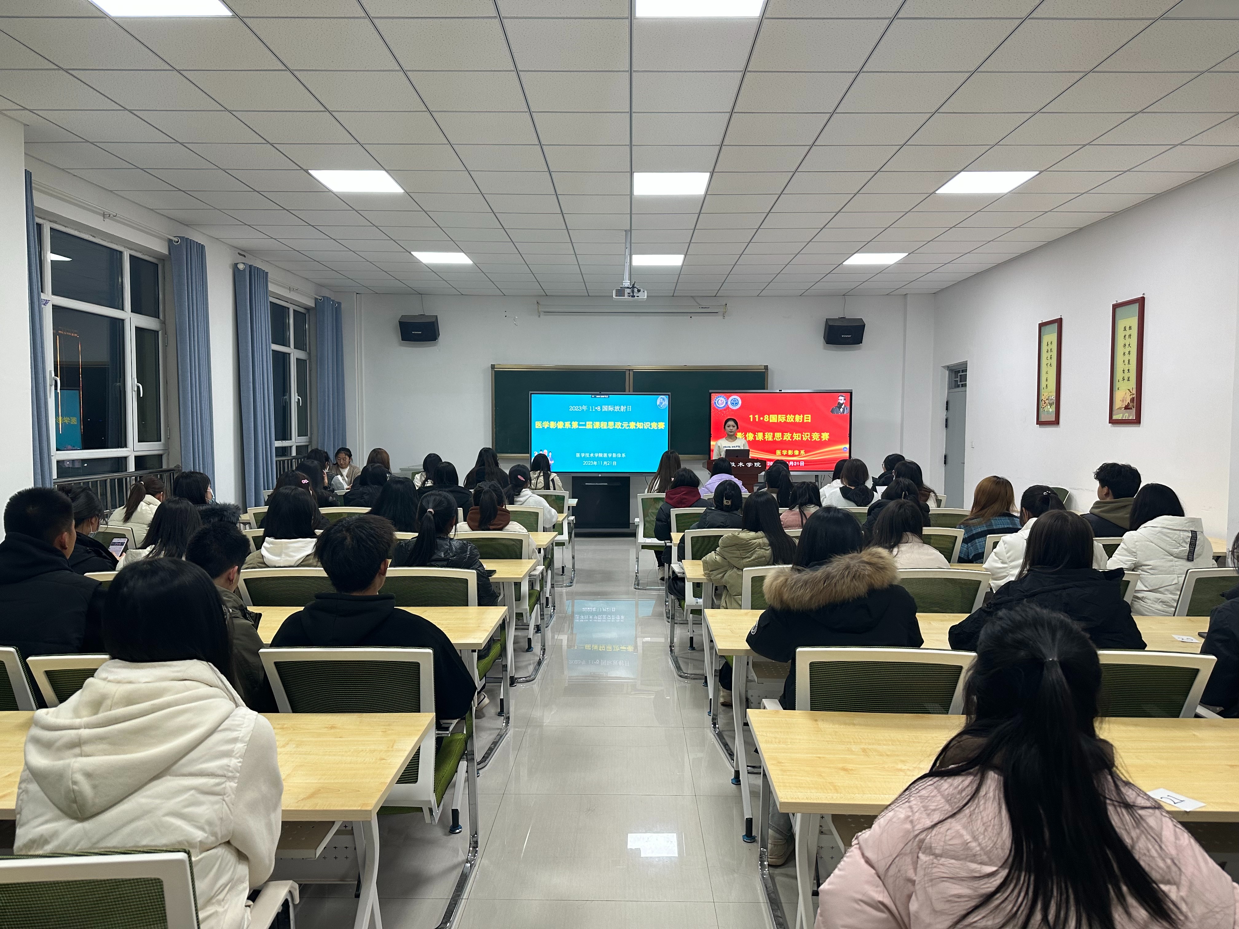 按照《医学技术学院2023年“11·8国际放射日”宣传及专业实践活动方案》,学院分别举行了启动仪式、超声检查进社区、学生演讲比赛、影像系第二届课程思政元素知识竞赛、影像系第一届大学生辩论赛共五项活动。为了拓展超声检查社会服务,特邀请行业专家——甘肃省人民医院梁丽副主任医师与影像系教师共同进社区入校园,联合兰州新区文曲社区党支部深度开展了党员共驻共建“双报到”服务社区群众活动,服务社区受检群众及学校师生40余人,并对诊断结果进行了解疑答惑。本次活动搭建了专业理论与临床实践之间沟通的桥梁,接触了临床真实场景与临床影像检查服务技能。“学生演讲比赛”活动参赛学生演讲激情热烈而富有感染力,以昂扬的斗志展现了影像学子的风采,最后角逐出12名获奖“演讲者”,提升了医学影像系学生的演讲水平,营造了“勇于挑战、超越自我”的学习氛围。“影像课程思政元素知识竞赛”活动中,竞答环节紧紧相扣,各参赛代表队团结协作、踊跃竞答,比分交替上升,现场氛围紧张而热烈,展现了学生的影像专业知识水平,进一步促进了学生们对医学影像专业的认同与热爱。
